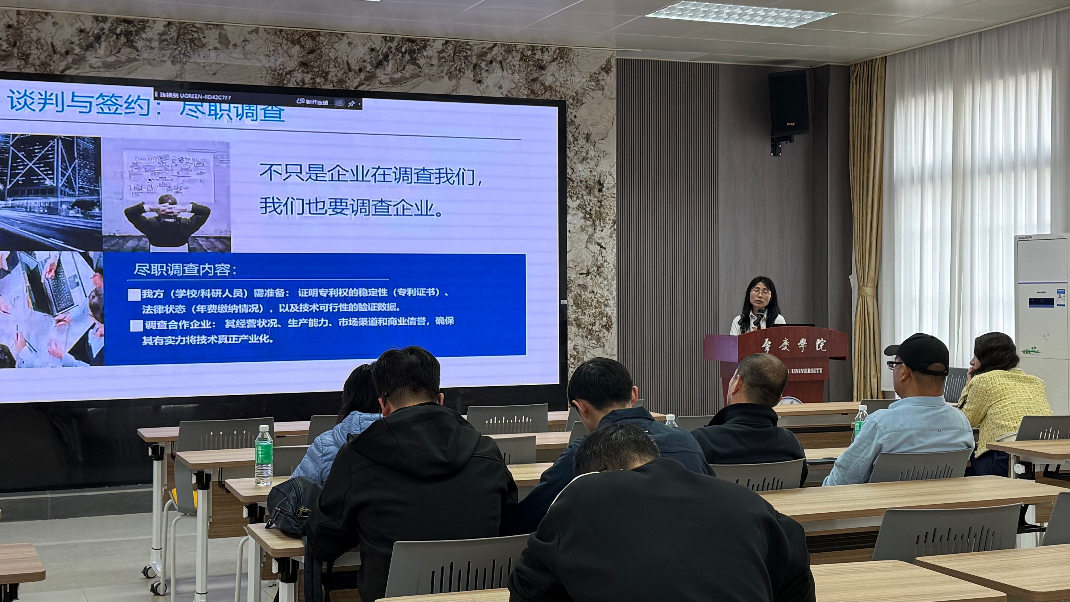 第二场讲座在12月3日下午进行,以“专利转让、许可赋能高校科技成果转化”为主题,重点探讨了高校专利成果如何通过转让和许可实现产业化。主讲人张红泉老师分享了成功案例,强调了知识产权在推动科技创新和经济发展中的核心作用,并介绍了相关政策支持,激发了师生对科技成果转化的兴趣。
